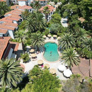 Хотелски соджини: Се состои од главна зграда во која се наоѓа Рецепција со Lobbybar и Ресторан, голем хол со фотељи каде гостите си го остваат багажот на денот на сместување и заминување со бесплатен Wi-Fi интернет. Неколку вили од кои секоја oд по 4 до 6 студија на приземје и 1-ви кат, опкружени со преубаво уредениот, огромен двор со многу зеленило, палми, трева, голем и мал (детски) базен, со лежалки, бар за пијалоци покрај базенот, игачки за деца.. Идеално место за одмор и релаксација. Во непосредна близина на хотелот се наоѓа пекара, маркет и ресторани за брза храна.