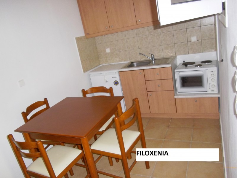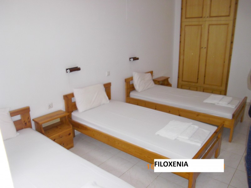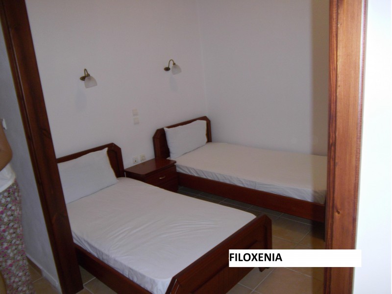 ВИЛА ФИЛОКСЕНИЈА се наоѓа во крајниот дел од плажата на Врахос. На 50 метри од плажа, со прекрасен двор, природни сенки од маслинови дрвја и лулашки за деца. Вилата има сопствен паркинг и лежалки на плажа кои се бесплатни доколку гостите порачаат пијалок од барот. Вилата располага со трокреветни студија и четворокреветни апартмани. Сите се со балкон, комплет опремена кујна, бања, фрижидер, ТВ и Wi-Fi, клима (со доплата 7евра на ден ), пешкири и постелнина се менува 2 до 3 пати во текот на престојот (зависно 7 или 9 ноќи), чистење секојдневно.